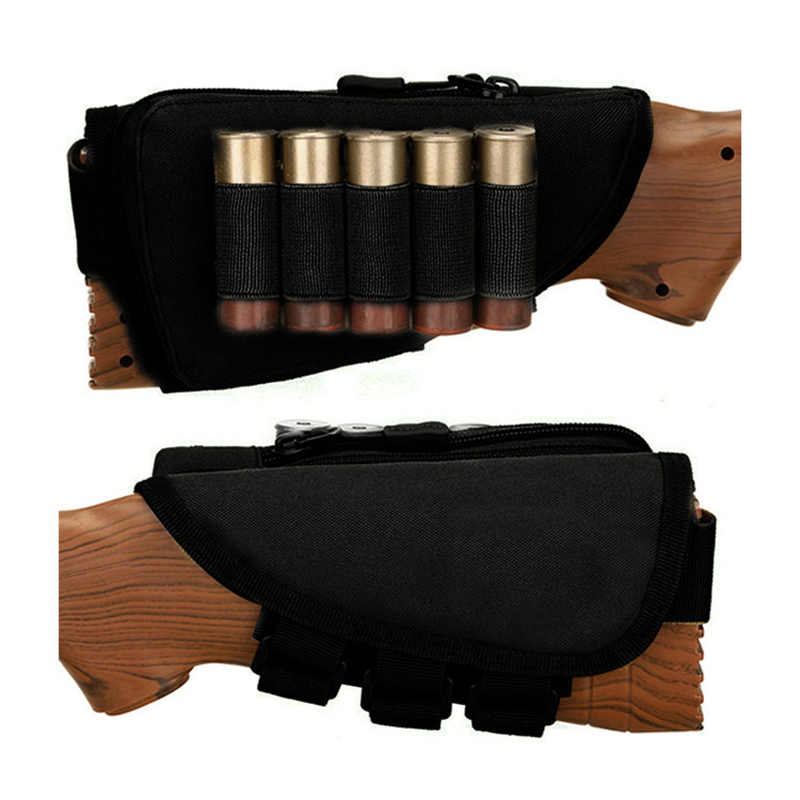 బట్స్టాక్ చీక్ రెస్ట్ మందు సామగ్రి సరఫరా హోల్డర్ సర్దుబాటు చేయగల షెల్ హోల్డర్ హంటింగ్ క్యారియర్ షాట్గన్ (5 రౌండ్లు) మరియు ఒక రైఫిల్ (7 రౌండ్లు) కోసం కుడి చేతితో కూడిన క్విక్ డిటాచ్ బుల్లెట్ బ్యాగులు. స్లాట్లు బయట రైఫిల్ బుల్లెట్ల కోసం.