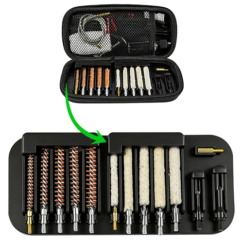 రైఫిల్ క్లీనింగ్ కిట్లో 5 సైజులు (.177, .22, .243, .27, .30 క్యాలరీలు), ఇత్తడి బ్రష్లు ఉంటాయి. మరియు కాటన్ మాప్స్, 5 రాడ్లు, 2 క్యాల్బ్లు. ఎంపికల కోసం ఇసుక మరియు నలుపు రంగు.