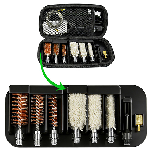 షాట్గన్ క్లీనింగ్ కిట్లో 3 పరిమాణాలు ఉంటాయి (12/16G, 20G, 410). ఇత్తడి బ్రష్లు మరియు పత్తి మాప్స్, 4 రాడ్లు 1 క్యాల్బ్. ఎంపికల కోసం ఇసుక మరియు నలుపు రంగు.